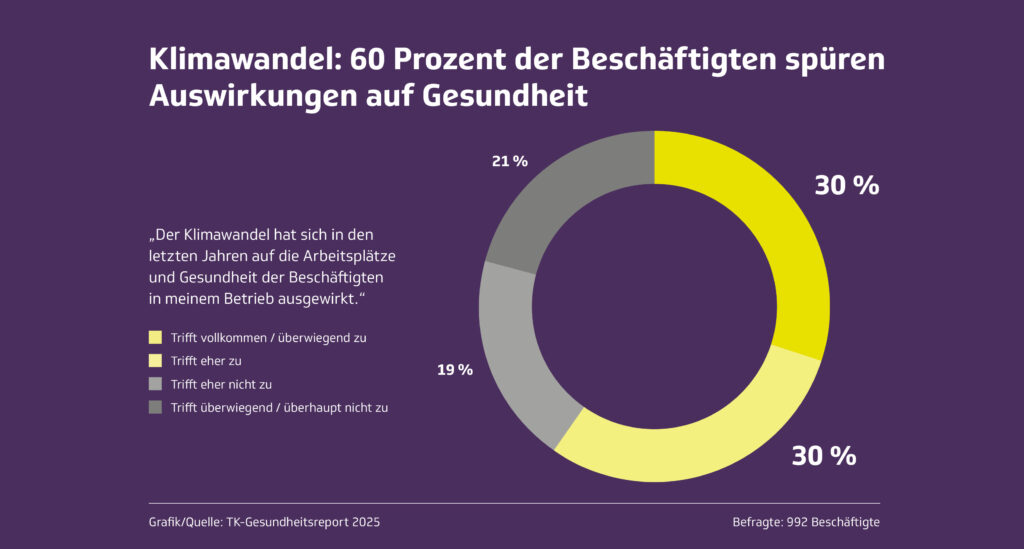 Hitzewellen, Extremwetterereignisse und Zukunftsängste: Der Klimawandel ist eine der größten Herausforderungen der heutigen Zeit. Seine Folgen wirken sich auch auf die Arbeitswelt und somit auf die Gesundheit der Erwerbstätigen aus. Eine aktuelle Umfrage unter rund 1.000 Beschäftigten aus verschiedenen Branchen zeigt: 60 Prozent der Befragten sagen, dass der Klimawandel ihren Arbeitsplatz und ihre Gesundheit bereits beeinflusst oder in den letzten Jahren beeinflusst hat.